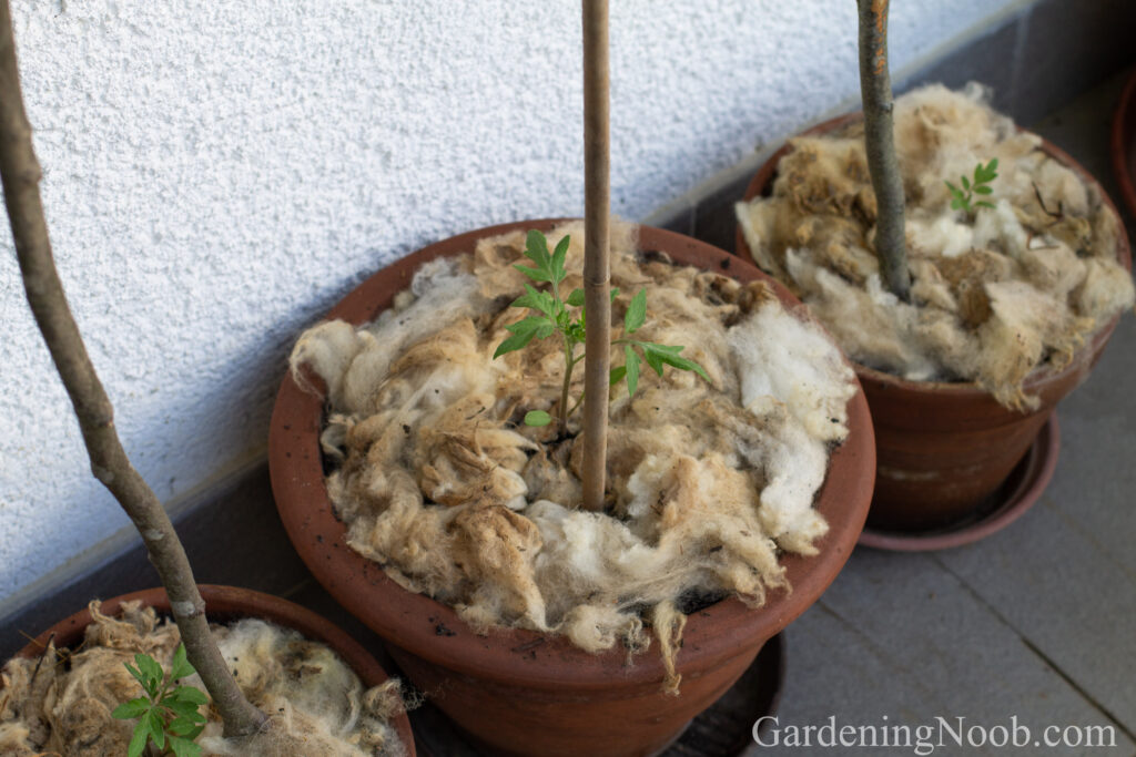 Ešte som to nespomenul, ale ovčiu vlnu používam aj pri pestovaní paradajok v kvetináčoch podobným spôsobom ako v záhrade. Pri presádzaní sadeníc paradajok časť zmiešam s pôdou. A po presadení sadeníc paradajok ňou tiež zamulčujem povrch kvetináčov. Robím to preto, aby som spomalil odparovanie vody počas horúcich letných dní.