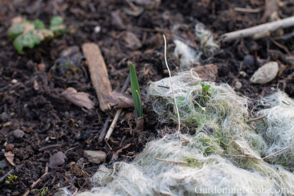V kvetináčoch, v ktorých som v predchádzajúcej záhradkárskej sezóne pestoval paradajky, zostalo ešte veľa nerozloženej ovčej vlny.