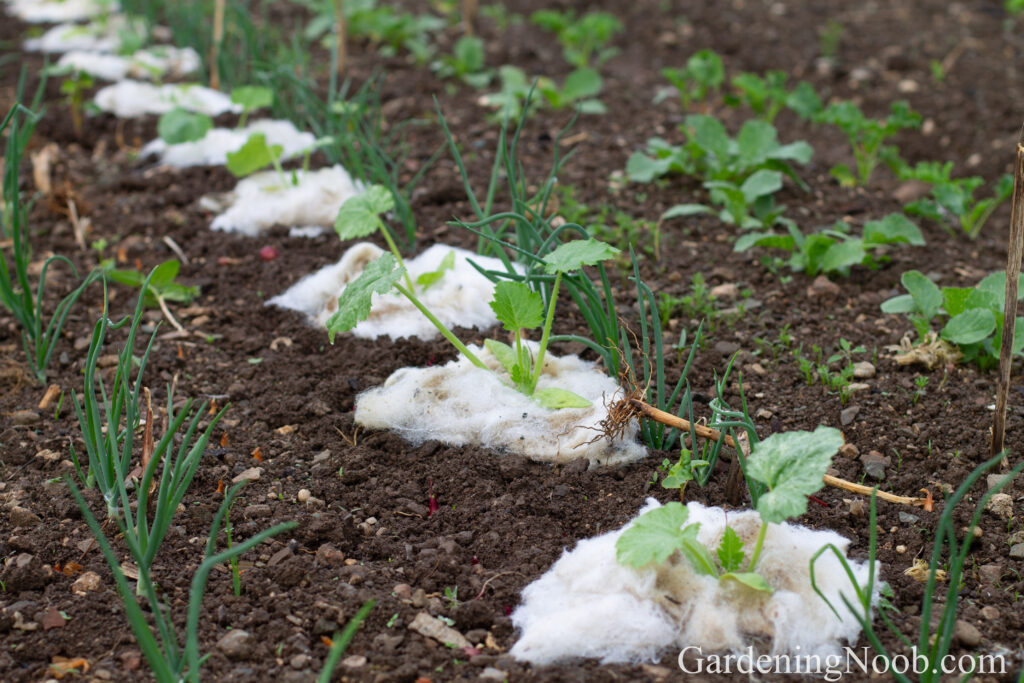 Takže, keď presadím sadenice zeleniny do záhrady, pokryjem holú pôdu okolo nich vrstvou ovčej vlny, ktorá je hrubá asi dva až tri centimetre. Vždy sa snažím pokryť čo najviac holej zeme, ale bohužiaľ, nie vždy mám k dispozícii neobmedzené množstvo vlny.