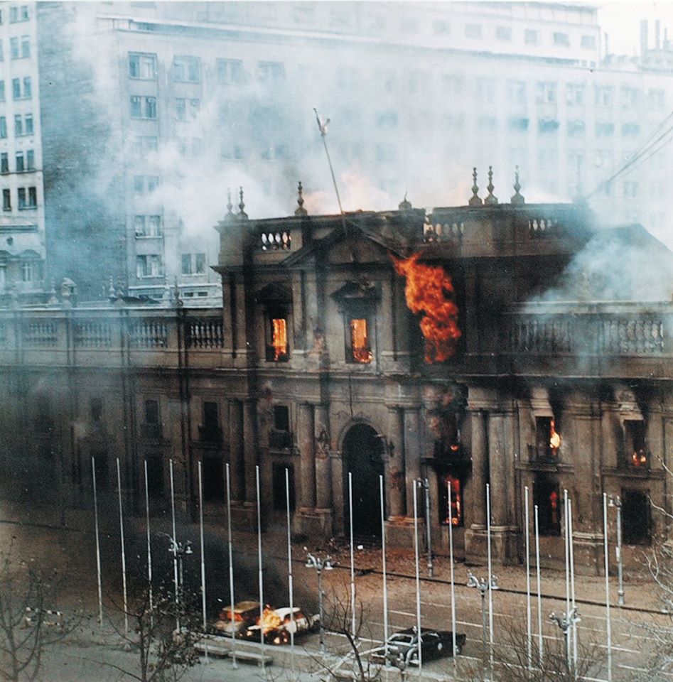 | Prezidentský palác La Moneda 11.9.1973 těsně po leteckém bombardování |