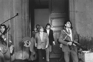 | Prezident Allende s ochrankou při bojích v paláci Moneda 11.9.1973 – je to poslední fotografie živého Allendeho. |