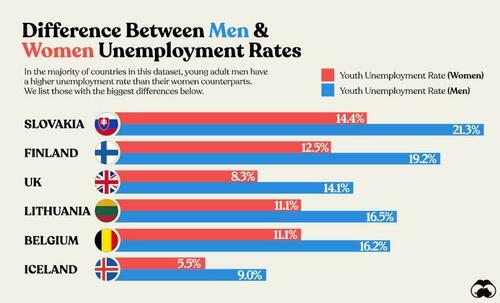 Níže jsou znázorněny země s největšími mezerami v nezaměstnanosti mladých lidí. Největší rozdíl je na Slovensku: