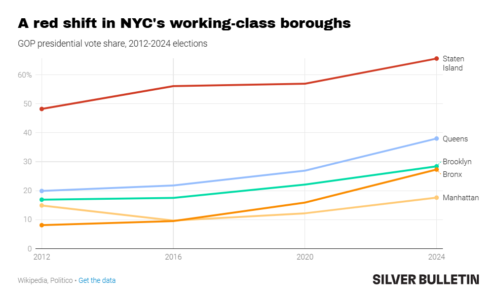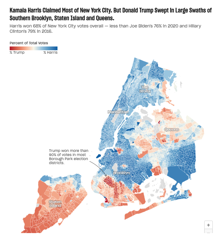 Velmi výrazný je stát New York, kde se posun netýkal jen venkovských oblastí, ale i samotného New York City. Celkově prohrál Trump stát New York “jen” v poměru 44:56, což už je v kompetitivní kategorii. V samotném New York City rovněž posílil a řada okrsků dopadla v jeho prospěch, byť většina z toho nebyla ani zdaleka.
