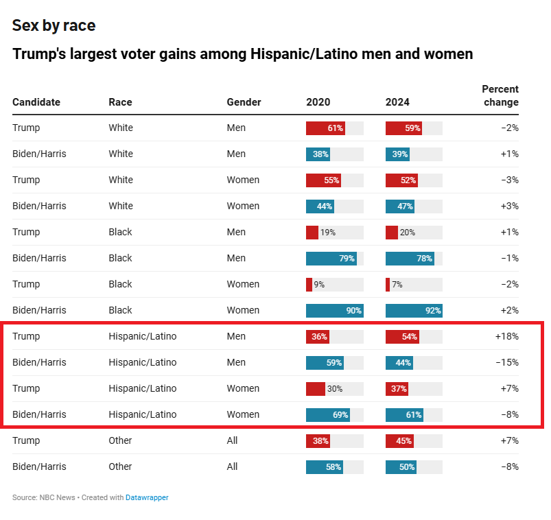 Postřeh třetí: Trump velmi zabodoval mezi Hispánci, zejména pak mezi muži, u kterých vyhrál. Posun od roku 2020 je značný. Demokrati dříve považovali Hispánce za automatickou součást své “barevné” volební koalice, stejně jako černochy; u černochů to víceméně stále ještě platí, ale amigos to vidí jinak.