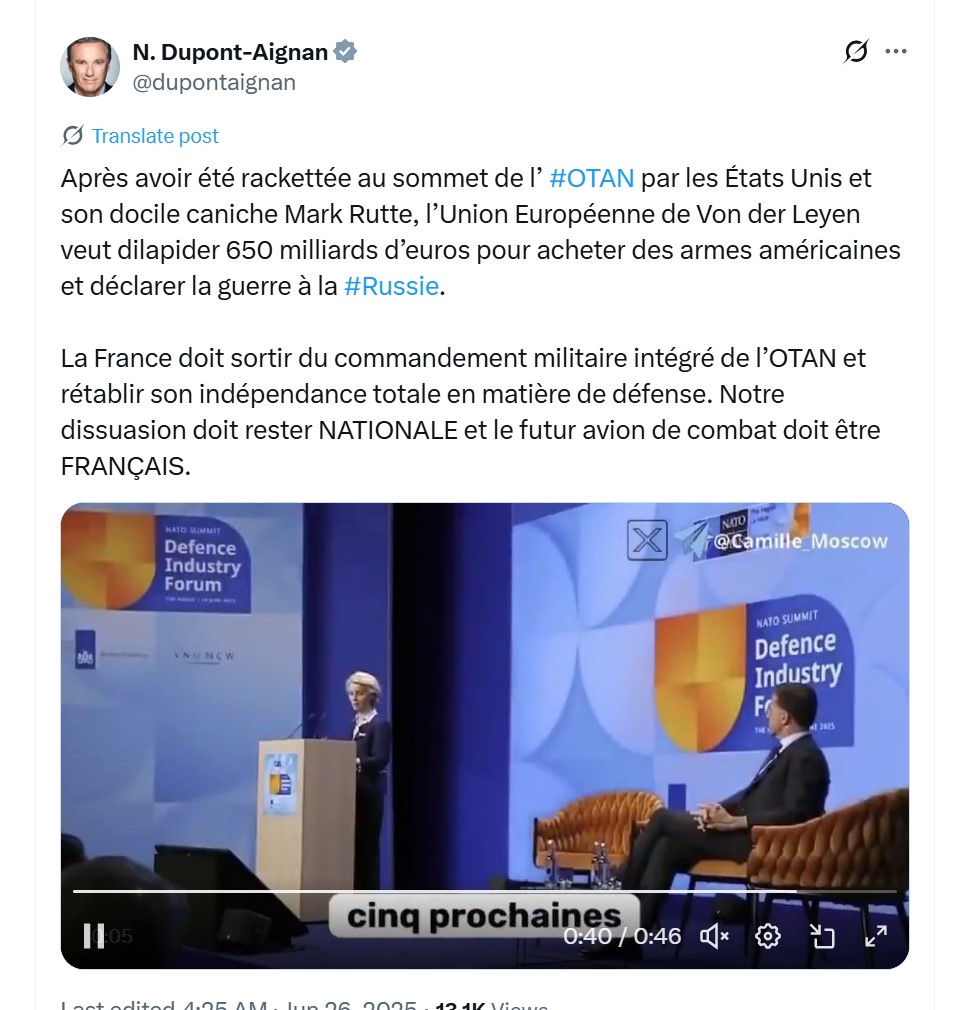 Překlad: Poté, co byla na summitu NATO vydírána Spojenými státy a jejich poslušným nohsledem Markem Ruttem, chce Evropská unie pod vedením Von der Leyenové utratit 650 miliard eur na nákup amerických zbraní a vyhlásit válku Rusku. Francie se musí stáhnout z integrovaného vojenského velení NATO a obnovit svou úplnou nezávislost v obranných záležitostech. Naše odstrašování musí zůstat NÁRODNÍ a budoucí bojové letouny musí být FRANCOUZSKÉ.