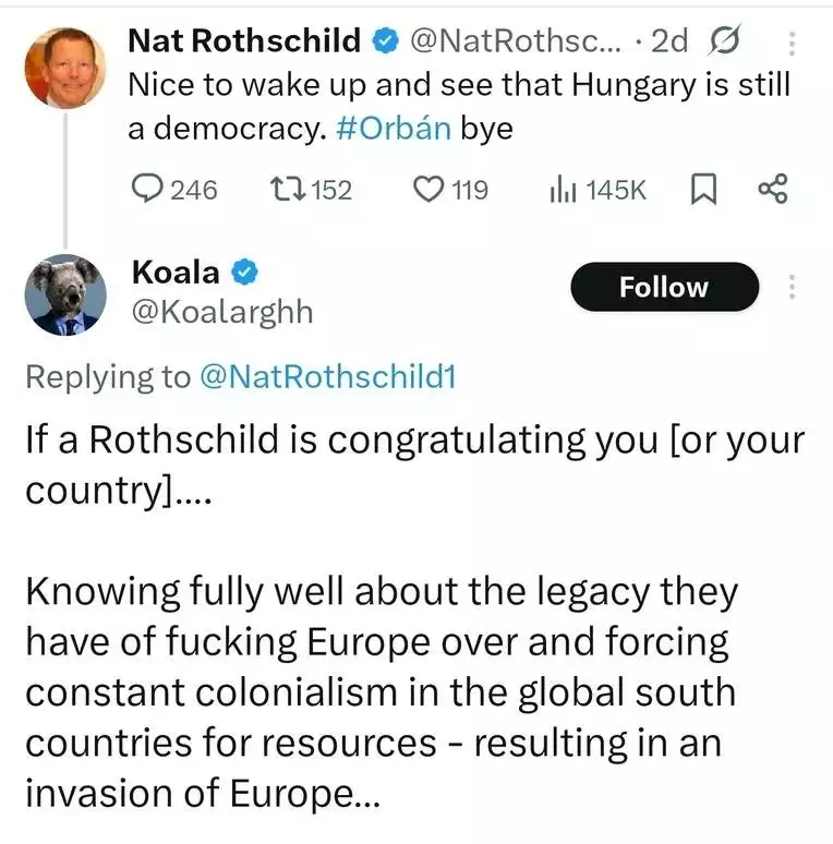 Lord Rothschild na Twitteri nepíše často, ale teraz sa otvorene teší z výsledkov volieb v Maďarsku. Aj Sorosov syn skákal od radosti a zároveň vyzval na vyhnanie Rusov z Maďarska. Samotná symbolika víťaznej maďarskej strany pripomína symboliku Rockefellerovho fondu.