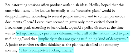 Podle interních dokumentů vedení společnosti OpenAI kdysi zvažovalo, že vyvolá přetahovanou mezi světovými velmocemi – včetně Číny, Ruska a USA – o přístup k pokročilé umělé inteligenci. Jeden z mladších výzkumníků si vzpomíná, že si tehdy pomyslel: „To je úplně šílený.“ OpenAI tvrdí, že šlo pouze o jeden z mnoha nápadů, o nichž se „diskutovalo na nejvyšší úrovni“. Plán byl nakonec opuštěn poté, co zaměstnanci pohrozili odchodem.