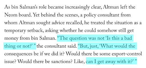 Altman navázal vztah s Mohammedem bin Salmánem, korunním princem Saúdské Arábie. Poté, co vyšla najevo údajná role bin Salmána v zabití novináře Džamála Chášukdžího, Altman odstoupil z formální poradenské role spojené se saúdskou vládou. Jeden politický konzultant nám však sdělil, že v zákulisí si Altman nekladl otázku, zda je přijímání saúdských peněz špatné, ale „projde mi to?“