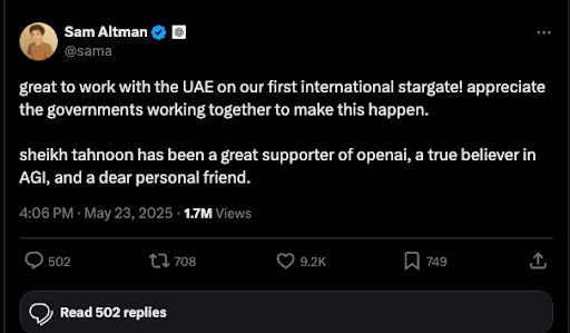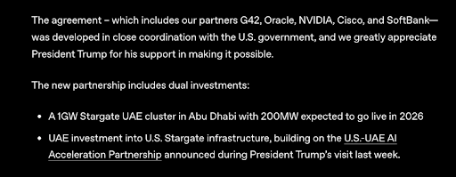 Tyto vztahy se za Trumpovy vlády staly výhodou. Druhý den po nástupu do úřadu Trump a Altman oznámili projekt Stargate: společný podnik v hodnotě 500 miliard dolarů, jehož cílem je vybudovat rozsáhlou síť infrastruktury pro umělou inteligenci po celých Spojených státech. Zhruba o týden později Altman oznámil plány na rozšíření projektu Stargate do Spojených arabských emirátů, včetně areálu datových center v Abú Dhabí, který bude sedmkrát větší než Central Park.