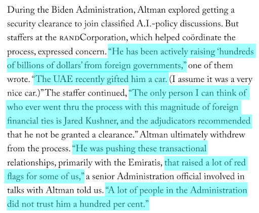 Během Bidenovy administrativy se Altman snažil získat bezpečnostní prověrku, aby se mohl účastnit utajených diskusí o politice v oblasti umělé inteligence. Zaměstnanec společnosti RAND Corporation, která pomáhala koordinovat tento proces, napsal, že Altman „aktivně získával ‚stovky miliard dolarů‘ od zahraničních vlád“ a že mu Spojené arabské emiráty darovaly auto – „předpokládám, že to bylo velmi pěkné auto“. Zaměstnanec pokračoval: „Jediná osoba, která mě napadá, že někdy prošla tímto procesem s tak rozsáhlými zahraničními finančními vazbami, je Jared Kushner, a rozhodčí doporučili, aby mu prověrka nebyla udělena.“ Altman svou žádost stáhl.
