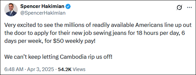 Vzorec Bílého domu tvrdí, že Vietnam účtuje 90% cla na USA. To není pravda. Mají malá dovozní cla. Obchodní deficit neexistuje proto, že by Vietnam stavěl nespravedlivé překážky, ale proto, že vietnamští pracovníci s nízkými mzdami vyrábějí spoustu věcí, které si Američané chtějí koupit (jako boty a trička Nike). Mezitím si titíž pracovníci (kvůli jejich nízkým mzdám) nemohou dovolit mnoho amerického zboží. Přesto nyní uvalujeme 46% daň na jejich vývoz do USA. V rozsahu, v jakém se tím sníží vývoz, sníží se i pravděpodobnost, že vietnamští dělníci budou kupovat americké zboží – nemluvě o devastaci jejich ekonomiky.