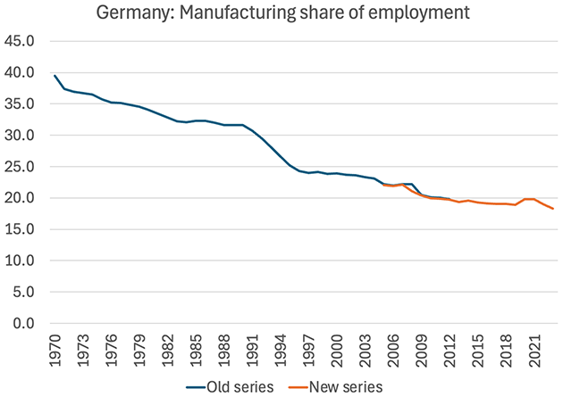 „Mezi lety 2000 a 2024 vzrostla obchodní bilance Německa jako podíl na jeho hrubém domácím produktu z deficitu 1,5 % na přebytek 5,8 %. Během stejného období se podíl pracovních míst v továrnách v zemi snížil z 20 % na 16 %. Studie z roku 2021 zjistila, že pokles podílu pracovních míst ve výrobě byl podobný v národních průmyslových střediscích průmyslové bilance navzdory rozdílům v národních průmyslových centrech v USA i Německu.