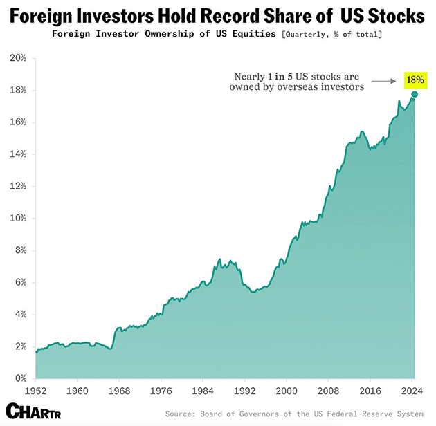 Od 4. čtvrtletí 2024 zahraniční investoři vlastnili 16,5 bilionu dolarů, neboli 18 %, amerických akcií – nejvyšší podíl v historii, podle údajů Federálního rezervního systému. To je nárůst z 8 % v roce 2000 a pouhých 2 % v 50. letech.