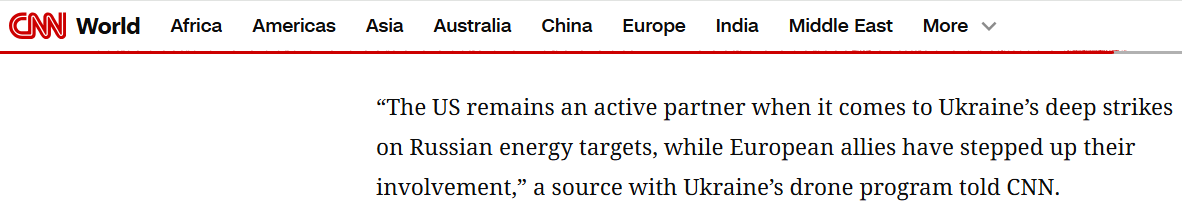 „„USA zostávajú aktívnym partnerom, pokiaľ ide o rozsiahle útoky Ukrajiny na ruské energetické ciele, zatiaľ čo európski spojenci zintenzívnili svoju účasť,“ povedal zdroj z ukrajinského programu dronov pre CNN.
