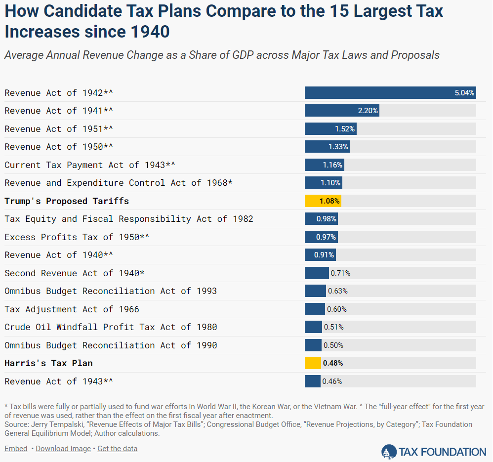 Oba kandidáti na prezidenta plánují významné reformy v daňovém systému. Organizace Tax Foundation (zde) porovnala očekávané změny příjmů z jejich daňových návrhů s historickými změnami od roku 1940, přičemž zprůměrovala roční změnu příjmů každého zákona nebo návrhu jako podíl na HDP. Harrisový daňový plán by se umístil na 15. místě mezi největšími zvýšeními daní od roku 1940 a na 6. místě mezi těmito zvýšeními mimo válečné období. Trumpova kombinace cel a daňových změn by byla na 6. místě mezi největšími daňovými škrty od roku 1940. Trump však naznačil, že by mohl zvýšit tarify bez schválení Kongresu. Pokud by se cla zvýšila bez současného snížení daní, umístila by se na 7. místo mezi největšími daňovými zvýšeními od roku 1940 a na 1. místo mezi těmito změnami mimo válečné období.