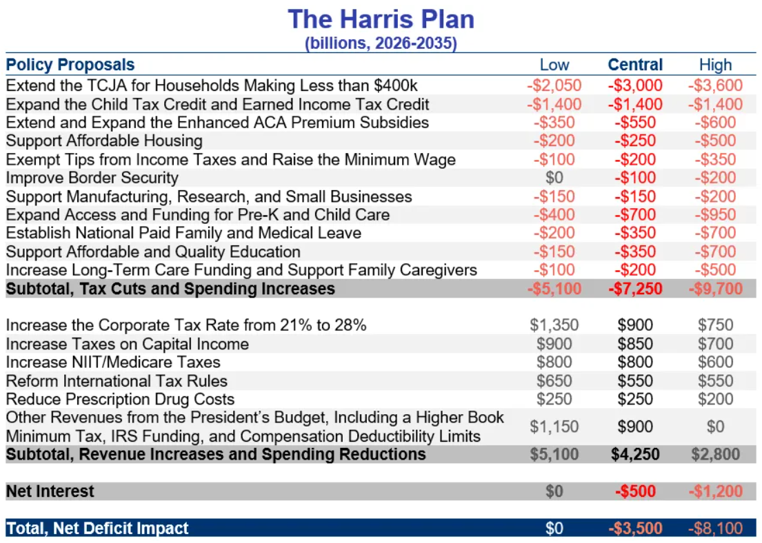Harrisová rovněž usiluje o trvalé prodloužení TCJA, avšak s odlišným zaměřením. Zavázala se, že jednotlivci s příjmy pod 400 tisíc dolarů nebudou čelit zvýšení daní a chce zrušit daňové úlevy pro nejbohatší Američany. Odhady CRFB naznačují, že prodloužení těchto daňových úlev by mohlo během deseti let stát přibližně 3 biliony dolarů, což představuje 42 % předpokládaných výdajů.