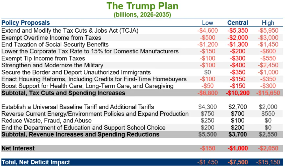 Trump se zasazuje o trvalé prodloužení TCJA a plánuje rozšíření o plné odepisování investic do vybavení a výzkumu pro firmy vyrábějící v USA. Odhady CRFB ukazují, že tato opatření by mohla zvýšit výdaje až o 5,35 bilionu dolarů, což představuje téměř 50 % plánovaných výdajů jeho programu. Navrhl také ukončení zdanění příjmů ze spropitného, příplatků za přesčasy a dávek sociálního zabezpečení. Zároveň plánuje snížení sazby daně z příjmu právnických osob z 21 % na 15 % pro domácí výrobce, což by mělo posílit konkurenceschopnost USA na globálním trhu. Snížení korporátních daní v USA by však mohlo vyvolat odliv firem z Evropy, která si nemůže dovolit závody o nejnižší zdanění.