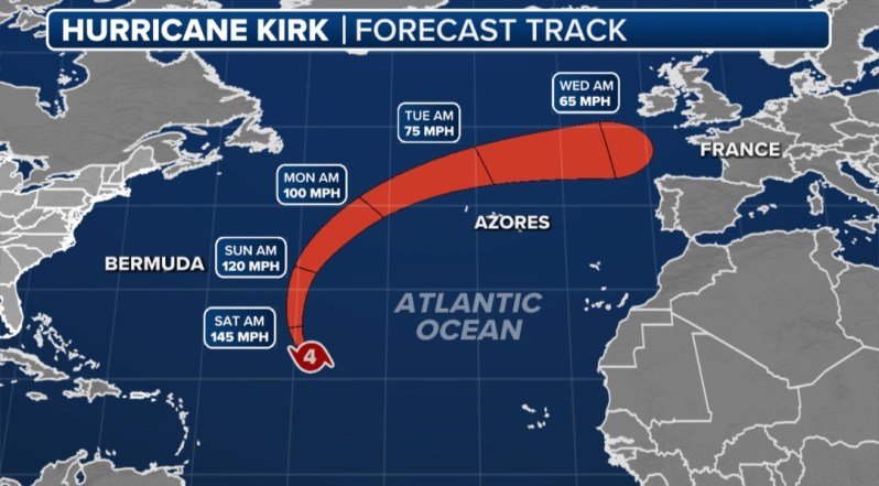 Kirk, silný hurikán, který v posledních dnech ovládl Atlantik, se chystá zasáhnout Evropu v podobě posttropické cyklóny. (Foto: X / Fox)