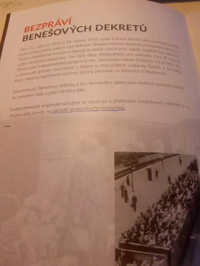 Zde na straně 12. je kapitola s názvem: BEZPRÁVÍ BENEŠOVÝCH DEKRETŮ, kde jednoznačně landsmanschaft uvádí, že chtějí diskriminující Benešovy dekrety zrušit a dále požadují “ SPRAVEDLIVÉ VYROVNÁNÍ“, což znamená finanční kompenzace za zabavený majetek.