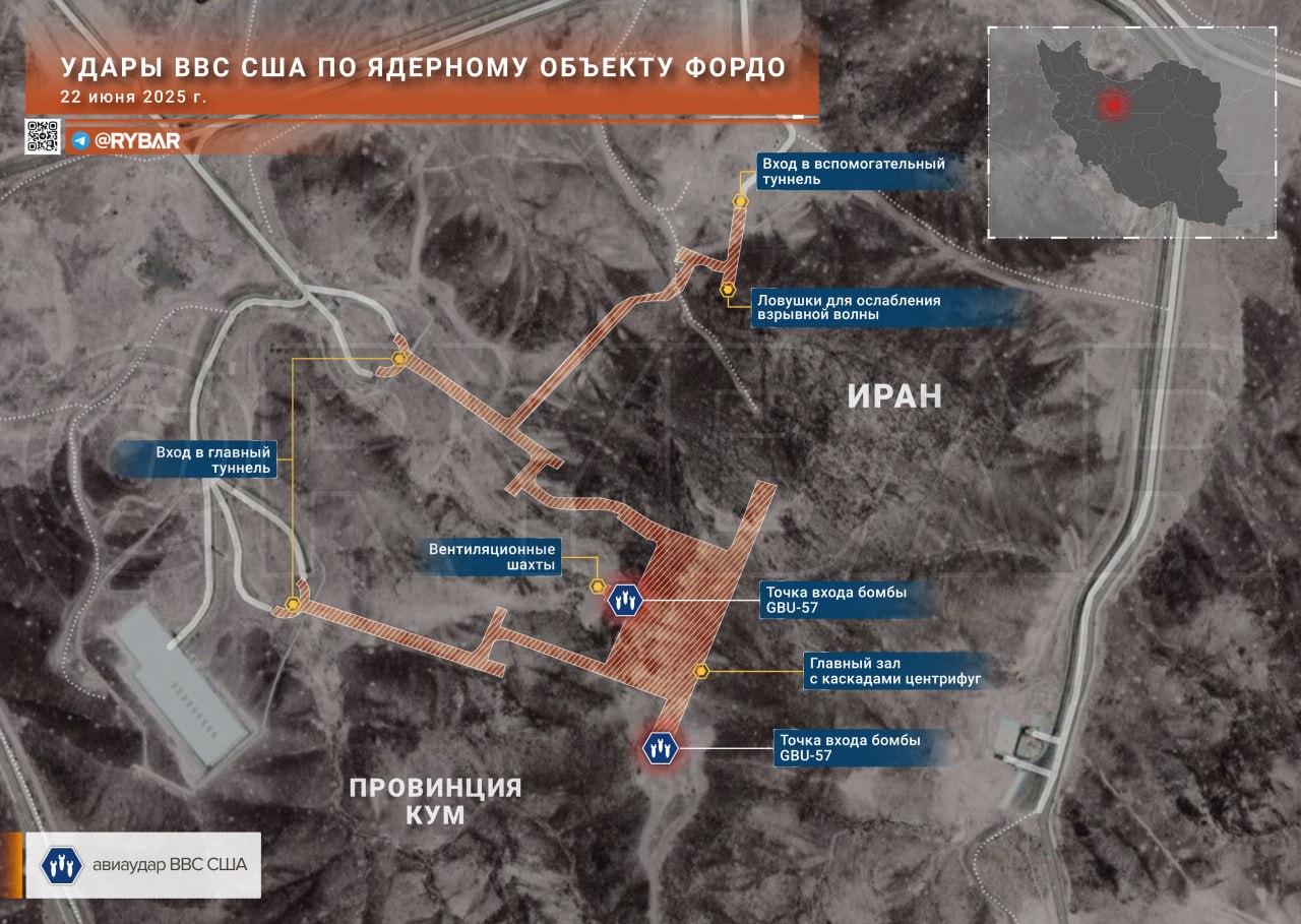 Mapa zachycuje Trumpovy bombardovací útoky proti iránskému centru obohacování uranu v podzemním bunkru Fordow. Podle ruských tvrzení nejméně jedna bomba zasáhla ventilační šachtu, a je tak možné, že objekt poškodila. Bunkr je nejméně 100 metrů pod povrchem, a US bomby GBU-57 by tak podle všech svých známých charakteristik do něj neměly proniknout.