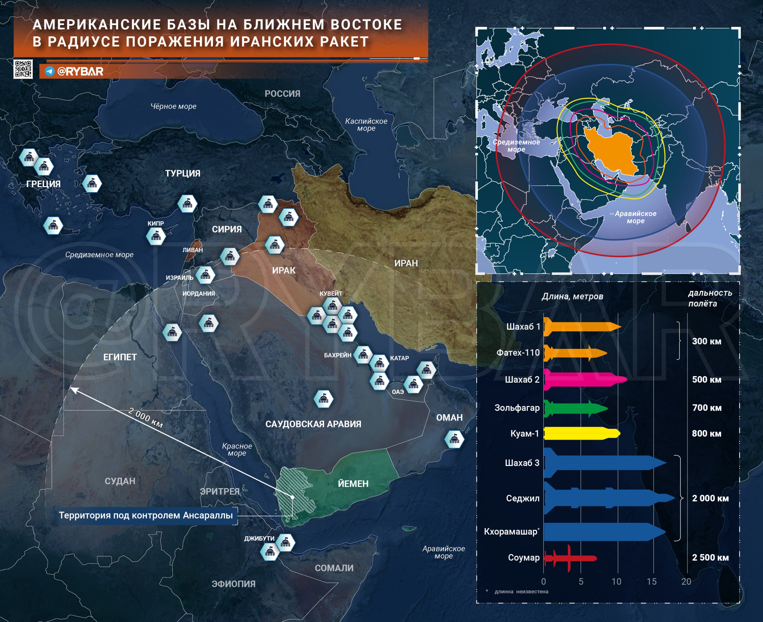 Dosah raket Húsiú znázorněn na velké mapě. Dosah iránských raket Cоумар podle malé mapy sahá až na střední a východní Slovensko, a na jih Itálie. Bílé hexagony jsou US válečné základny, které se nacházejí v iránském dostřelu. O iránských střelách Cоумар se spekuluje, že by mohly mít dolet až 3000km. Vzdálenost ze severozápadního Iránu u arménských hranic do Prahy je přitom jen 2650km. Pokud jsou tedy spekulace správné, je i celá ČR v dosahu těchto raket Cоумар, a Fialova vláda není stále schopna zařídit ani jednu baterii raket Patriot, nebo podobných anti-raket, na naši ochranu před tímto potenciálním iránským útokem! Opět se tak krásně ukazuje, jak celou Fialovu politickou bandu ochrana našich občanů před potenciálními riziky, vyplývající z jejich avanturistické politiky, nezajímá ani za mák.