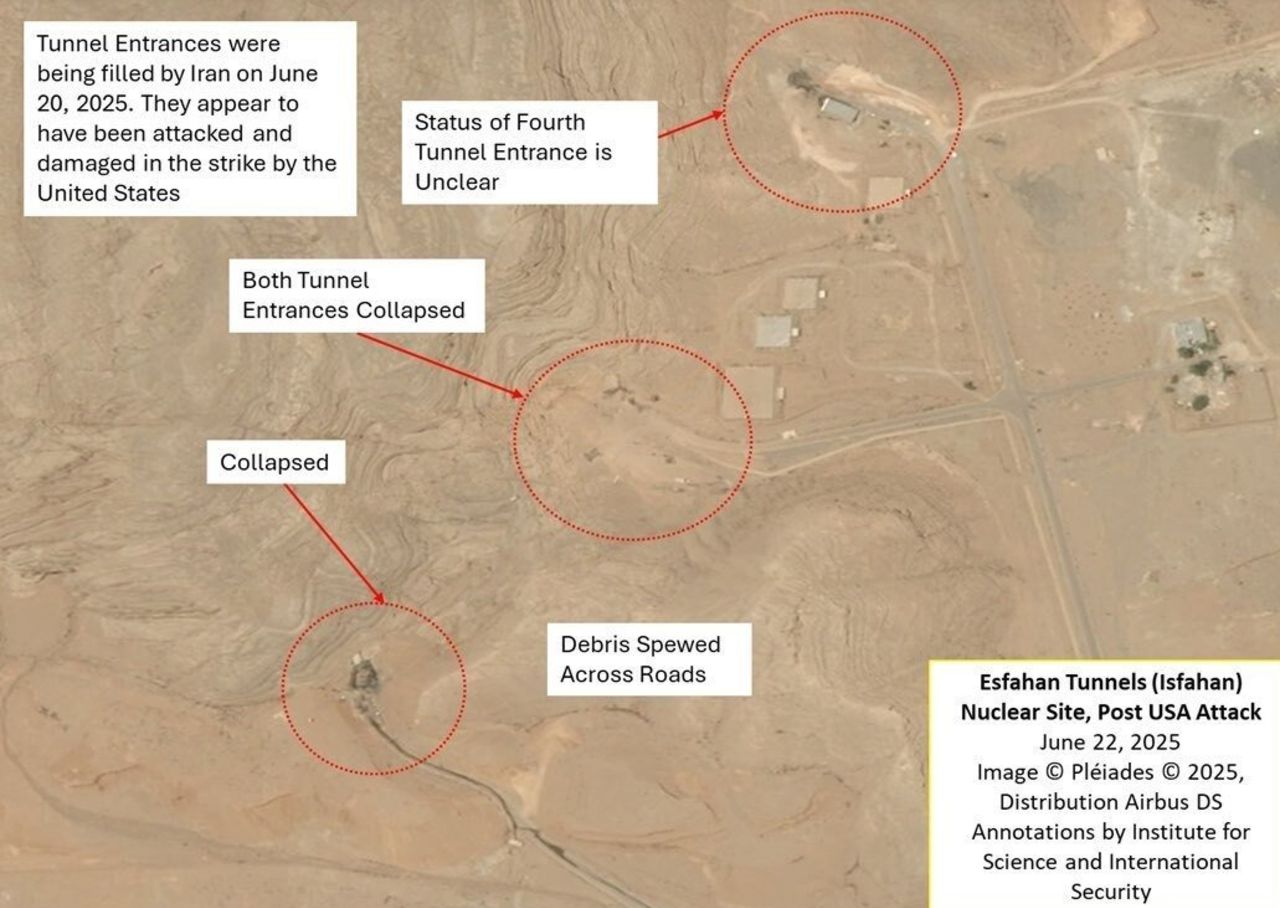 Další iránské zařízení na obohacování uranu Isfahan bylo včera napadeno pouze raketami Tomahawk. Podle satelitních snímků se zdá, že nejméně tři ze čtyř vchodů do podzemního komplexu jsou zavaleny. Nicméně je známo, že Irán od pátku tyto vchody sám “intenzivně zahrnoval zeminou”, a není tak jasné, zde rakety Tomahawk dokázaly “zeminou zahrnuté vchody do tunelů” dostatečně poškodit, a zda systém podzemních chodeb a tunelů utržil nějaká poškození.
