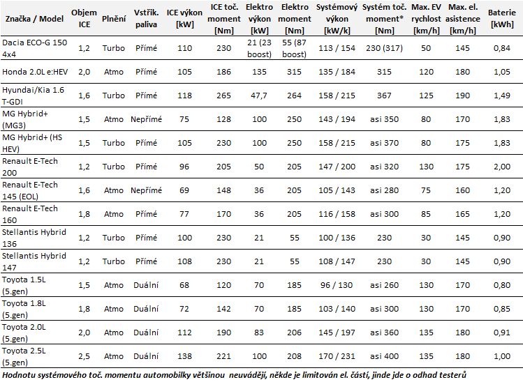 Parametry většiny hybridních pohonů pro vozy nižší střední a střední třídy shrnuje následující tabulka, jejíž sestavení dalo překvapivě dost práce. Myslel jsem si naivně, že sehnat základní technické údaje od automobilek bude v době internetu úkol na chviličku. Stáhnete si prospekty, porovnáte…ale ouha: třeba to důležité, co fakticky hýbe autem, tedy točivý moment pohonu, ten dostanete jen někdy a jen od něčeho, často jen od jeho spalovací části. Ale co točivý moment systémový, který máte reálně pod pedálem plynu? A jak moc se elektromotor zapojuje? A do jaké rychlosti?