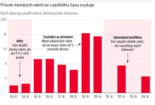Analýza The Telegraph naznačuje, že zatímco drtivá většina íránských raket byla zachycena, podíl těch, které prošly, v prvních osmi dnech dvanáctidenní války neustále rostl.