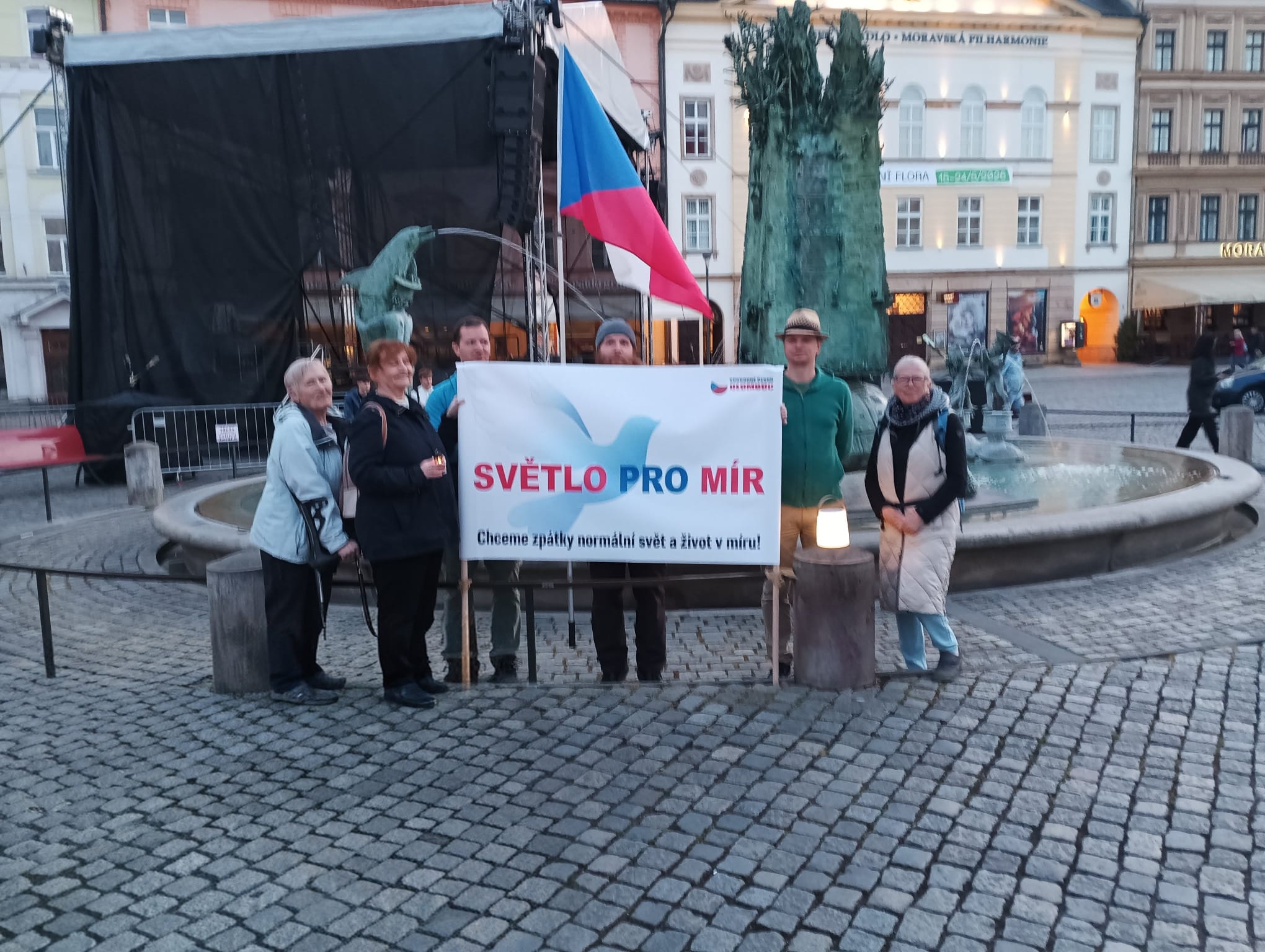 Včera se v Olomouci svítilo za mír a proti sjezdu SL v Brně a kdekoli na území ČR. Počasí nám přálo a na náměstí bylo docela rušno kvůli chystání tvarůžkového festivalu. Sešlo se nás sedm