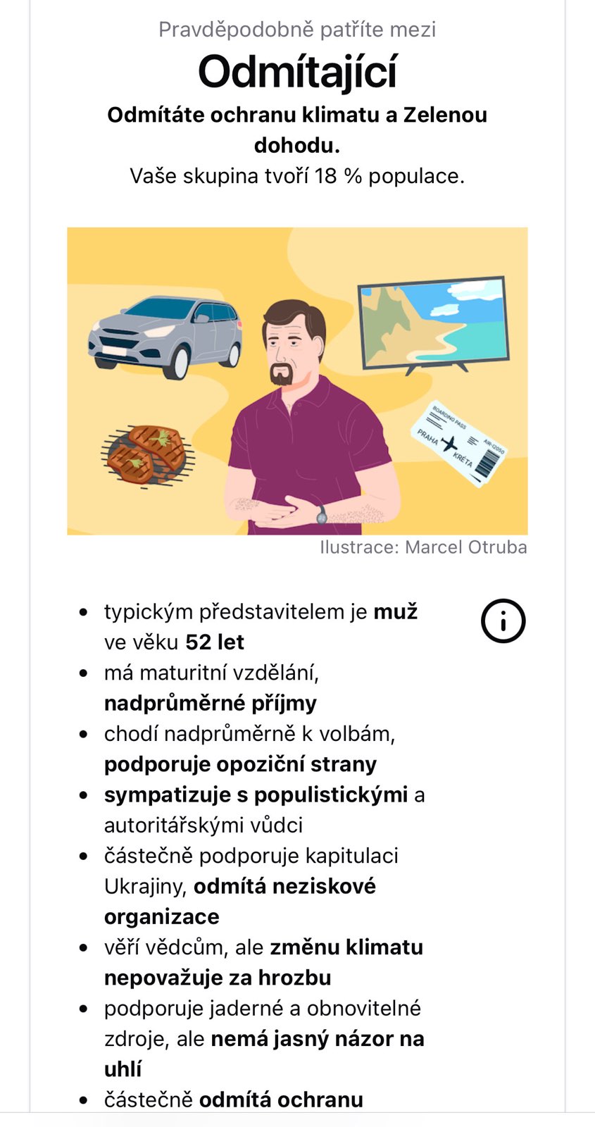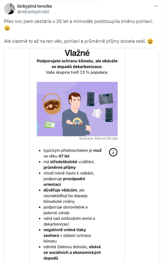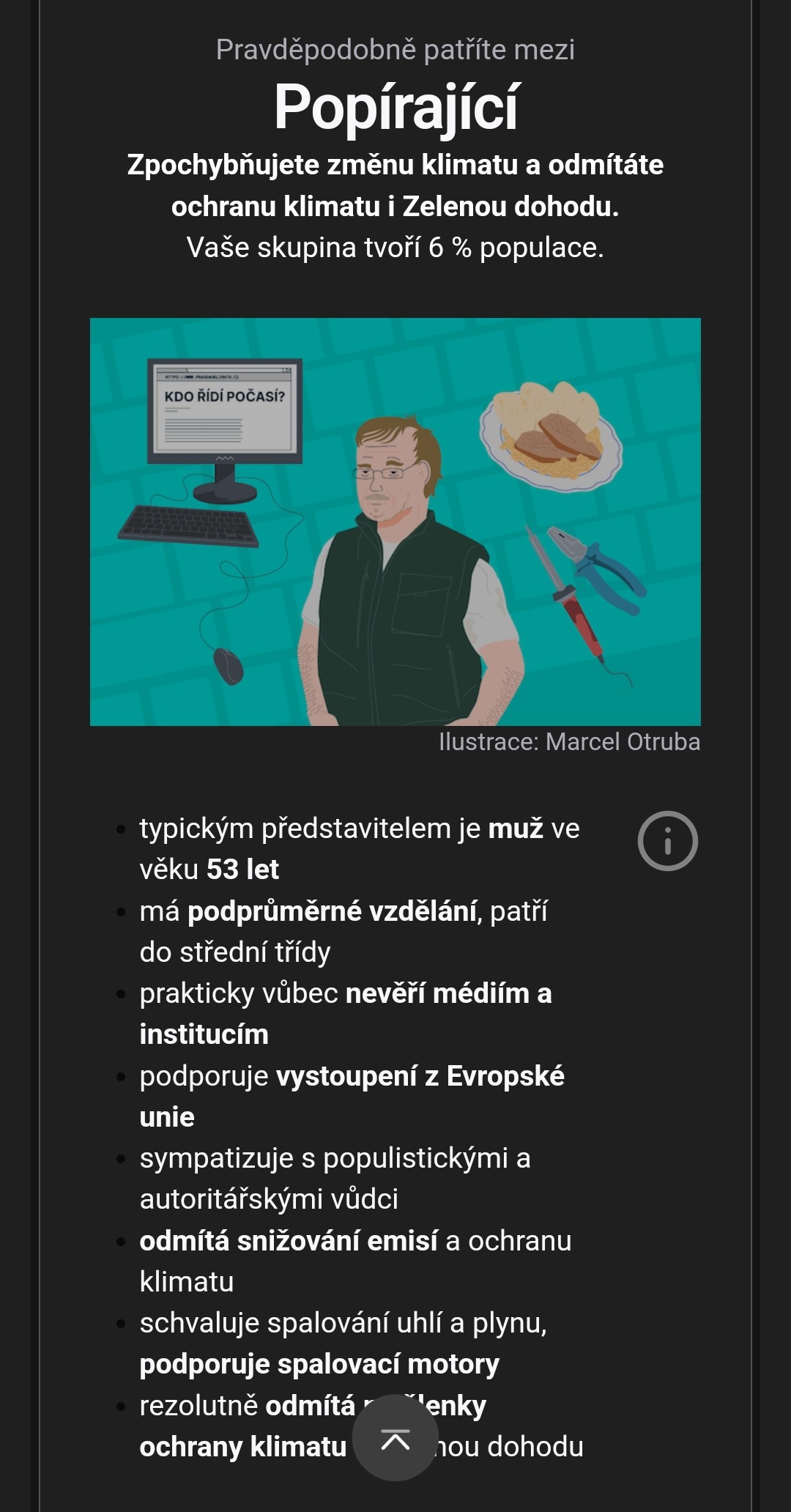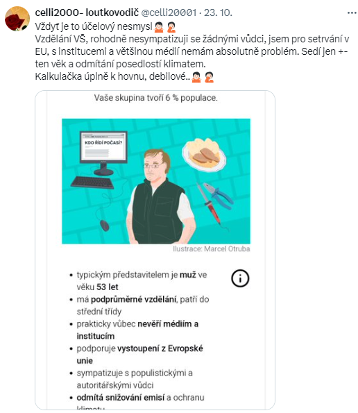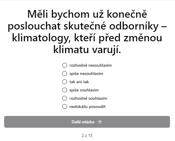 Podstatou projektu České klima 2024 je kalkulačka, která vás pomocí otázek ohodnotí na ose osob angažovaných ve věci klimatu, přes sympatizující až po odmítače a popírače. Otázky jsou, jak to říct…, poněkud návodné. Asi jako “Která je vaše nejoblíbenější historická osobnost a proč právě soudruh Lenin?”