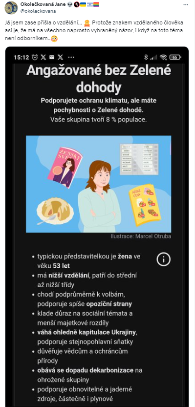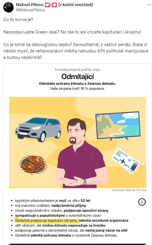 Průzkum způsobil na sociálních sítích menší pozdvižení. Ne každý totiž ocenil, že pokud plně nepodporujete Green Deal, znamená to, že jste například pro kapitulaci Ukrajiny…