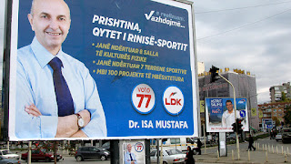 | Dosluhující premiér Isa Mustafa na volebním bilboardu (2017) |