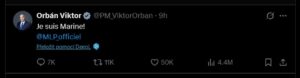 Další ze spojenců Le Penové, maďarský premiér Orbán na síti X přidal příspěvek „Je suis Marine“, který připomíná stejný slogan „Je suis Charlie“, který byl spojen s útokem na redakci Charlie Hebdo.