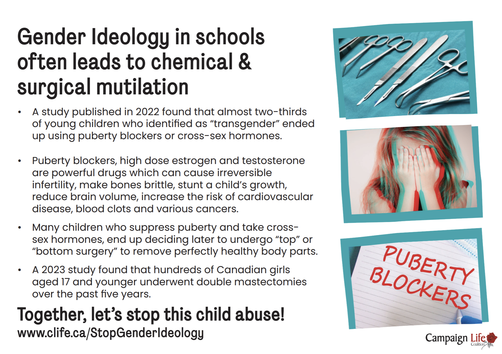 “Blokátory puberty, vysoké dávky estrogénu a testosterónu sú silné lieky, ktoré môžu spôsobiť nezvratnú neplodnosť, spôsobiť krehkosť kostí, zastaviť rast dieťaťa, zmenšiť objem mozgu, zvýšiť riziko kardiovaskulárnych ochorení, krvných zrazenín a rôznych druhov rakoviny,” vysvetľoval leták.