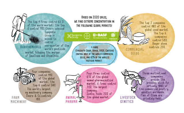 Jejich zjištění ukázala, že mnoho zemědělsko-potravinářských odvětví je nyní tak provázaných, že je ovládají pouze čtyři až šest dominantních firem, což těmto společnostem umožňuje mít obrovský vliv na trhy, zemědělský výzkum a vývoj politik, což podkopává potravinovou suverenitu.