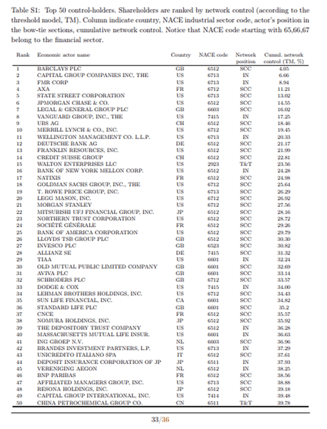 Článek poskytuje žebříček 50 nejvýznamnějších ekonomických aktérů podle globální kontroly (viz níže), přičemž mnoho z nich patří do finančního sektoru – včetně společností jako Barclays, Capital Group, AXA, State Street a Vanguard – a je součástí extrémně propletené sítě kontroly.