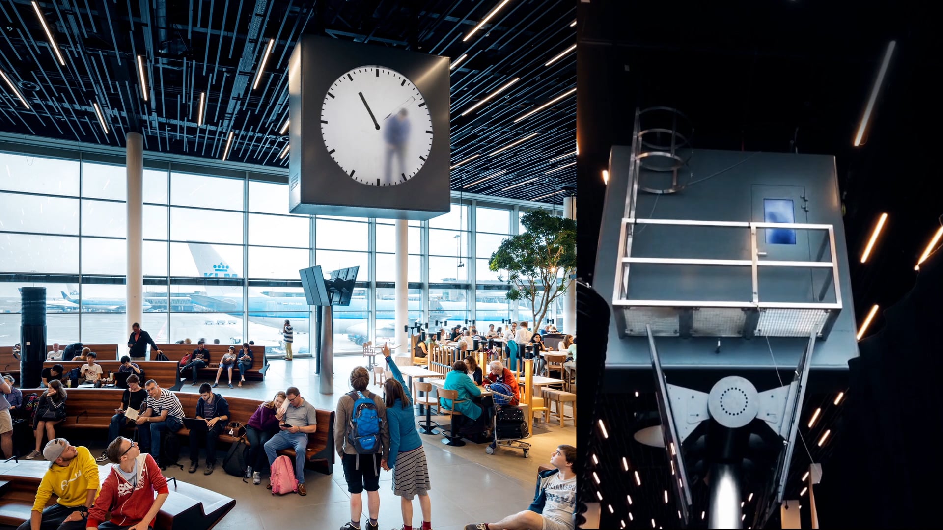 Úžasné “živé” hodiny s člověkem uvnitř, najdeme na amsterdamském letišti Schiphol a vytvořil je renomovaný holandský umělec a designér Maarten Baas. Jedná se o přesvědčivou iluzi a onen zaneprázdněný malíř je ve skutečnosti dvanáctihodinová nahrávka (maluje ručně každou minutu). Letištní hodiny Schiphol vytvořil Baas v roce 2016. Muž uvnitř hodin má na sobě modrou kombinézu a v kapse žlutý hadr. To má být spolu s jeho červeným kbelíkem poctou slavnému nizozemskému umělci Mondrianovi (1872-1944). Hodiny jsou vidět na mezinárodním terminálu letiště, takže je vidí pouze lidé, kteří opouštějí Evropskou unii přes Schiphol, a bohužel tak jsou skryty pro cestující na vnitrozemských linkách.