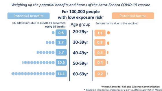 Pro děti nedává očkování u nemoci, kterou pohodově zvládají smysl, a všichni mezi tím by měli mít možnost individuálně vyhodnotit, co je pro ně prospěšnější. Rozhodovat se ze zdravotních důvodů, ne z donucení expertů. Podle uvedeného logicky u mladších a zdravých zásadně klesá riziko vážnosti nemoci, a tak relativně stoupá výkyt nežádoucích účinků po očkování, jak třeba ilustruje toto vyhodnocení u očkování AstraZenecou: