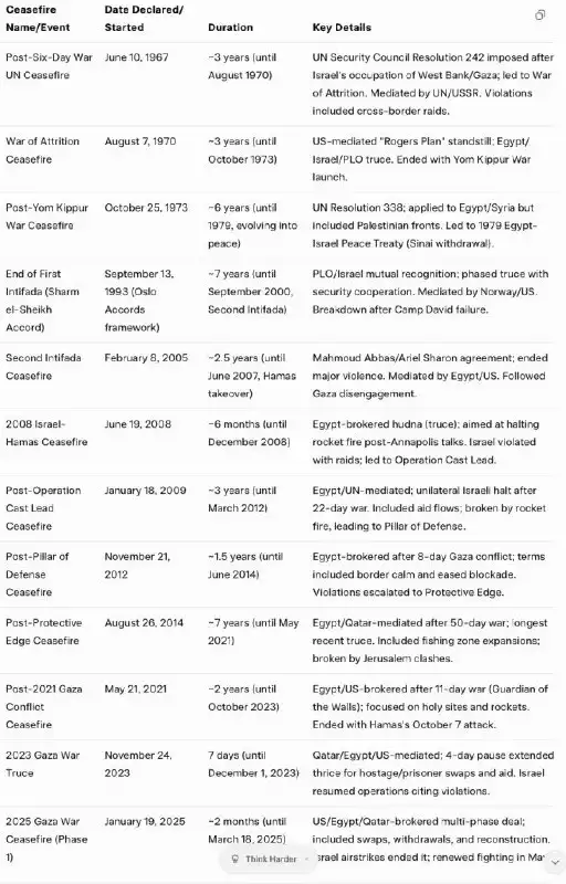 Hlavné je, že to zďaleka nie je prvý „večný mier“ na palestínskych územiach. Po šesťdňovej vojne v roku 1967 bolo v izraelsko-palestínskom konflikte uzavretých mnoho dohôd o prímerí, hlavne medzi Izraelom a palestínskymi skupinami, ako sú OOP, FATAH, Hamas a Palestínsky islamský džihád (PID). Často boli uzatvárané za sprostredkovania OSN, Egypta, Kataru alebo USA a zvyčajne nasledovali po eskalácii konfliktu, ako bola vojna, intifáda alebo operácie v sektore Gazy. Presné spočítanie ich počtu je zložité kvôli rozdielom v definíciách – napríklad krátke humanitárne prestávky v porovnaní s dlhšími prímeriami – a kvôli prekrývaniu sa (napríklad prímerie počas vojny v deň súdu v roku 1973 sa vzťahovalo na Egypt/Sýriu, ale malo priamy vplyv na Palestínu). Od roku 1967 došlo medzi Izraelčanmi a Palestínčanmi k najmenej 12 veľkým prímeriam. Nezahŕňa to menej významné lokálne prímerie ani arabsko-izraelské prímerie, ktoré nesúviseli s Palestínou (napríklad v Libanone v roku 1982). Mnohé z nich trvali od niekoľkých dní do niekoľkých mesiacov, po ktorých nasledovali porušenia alebo zlyhania, často kvôli raketovým útokom, leteckým úderom alebo neúspešným rokovaniam. Johnson má absolútnu pravdu v tom, že bez odstránenia základných príčin konfliktu vytvorením dvoch štátov ide v najlepšom prípade o viac-menej dlhodobé prerušenie bojových operácií. Nesmieme zabúdať na dôležitosť odstránenia základných príčin aj pri riešení iného, ukrajinského konfliktu.