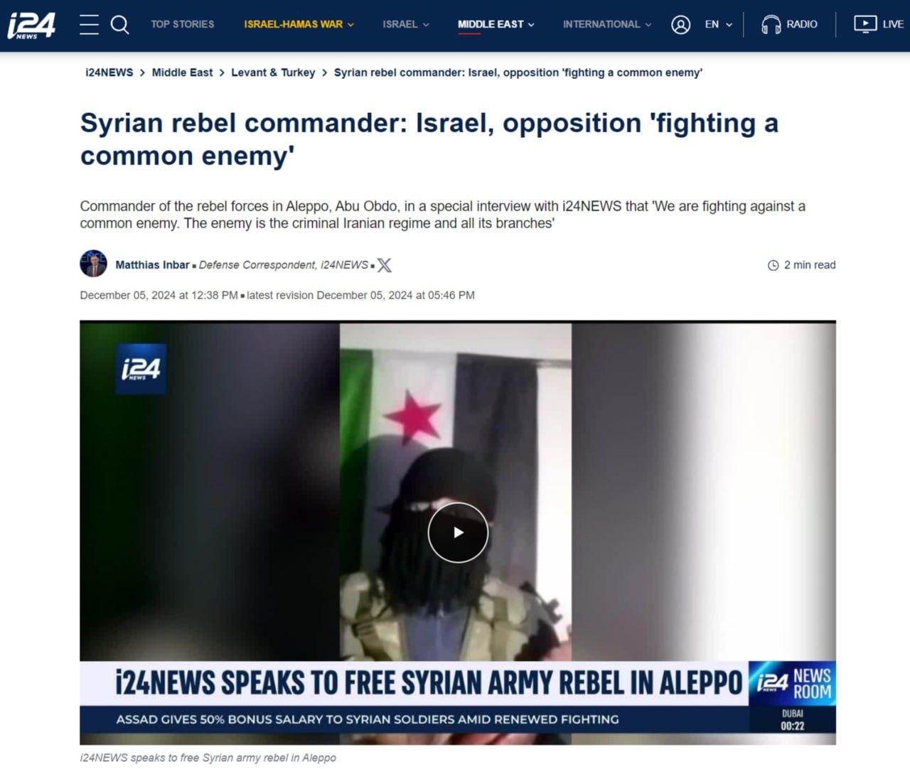 Jeden z veliteľov islamistických militantov, ktorí sa zmocnili mesta Aleppo v Sýrii, ktorý si hovorí Abu Abdo, poskytol včera rozhovor izraelskému kanálu i24NEWS. Povedal, že Irán a jeho zástupné sily vrátane Hizballáhu a “Asadovho režimu” sú zločineckými organizáciami, ktoré “snívajú o návrate do čias niekdajšej slávy historickej Perzskej ríše”.