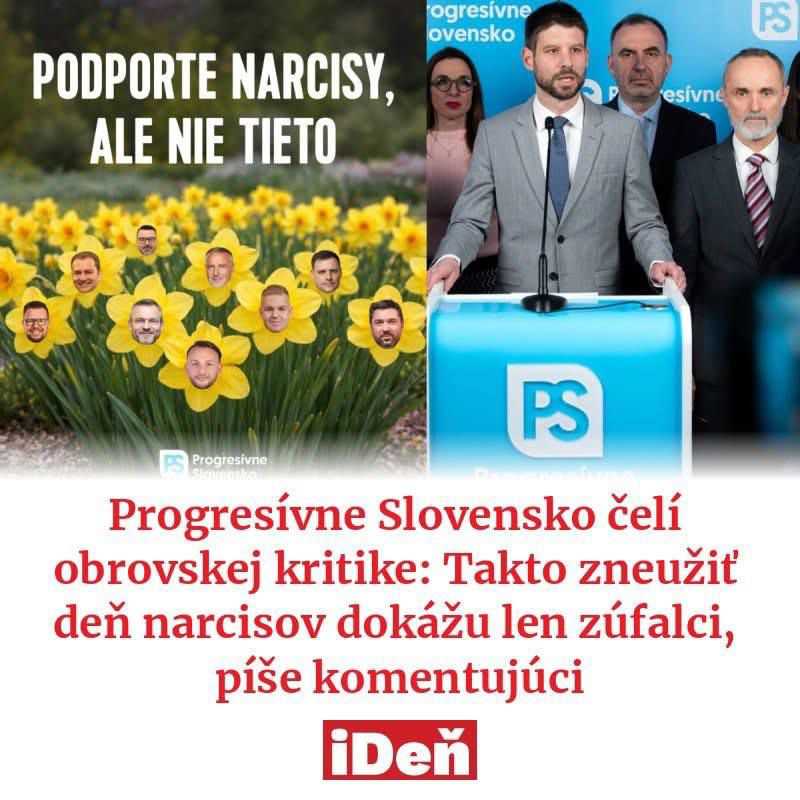 Opozičné hnutie Progresívne Slovensko vyvolalo kontroverziu príspevkom k Deň narcisov. Satirická grafika s podobizňami politikov na kvetoch narcisov a ostrý sprievodný text vyvolali na sociálnych sieťach stovky kritických reakcií.