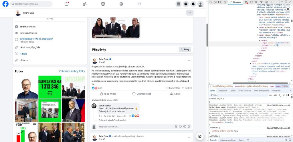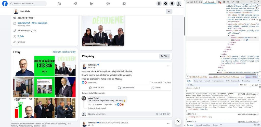 Příspěvek na Facebooku Petra Fialy včetně odpovědi jeho fanouška je samozřejmě totální podvrh, který pro účely našeho článku připravil náš administrátor, abychom “vyslali jasný signál” a demonstrovali, jak snadno lze zfalšovat jakýkoliv příspěvek na jakémkoliv Facebooku. Myšleno lokálně zfalšovat, aby to tak vypadalo na vašem počítači, ne doopravdy na serverech Facebooku. Stačí k tomu jenom základní znalosti obsluhy tzv. vývojářské konzole ve webovém prohlížeči.