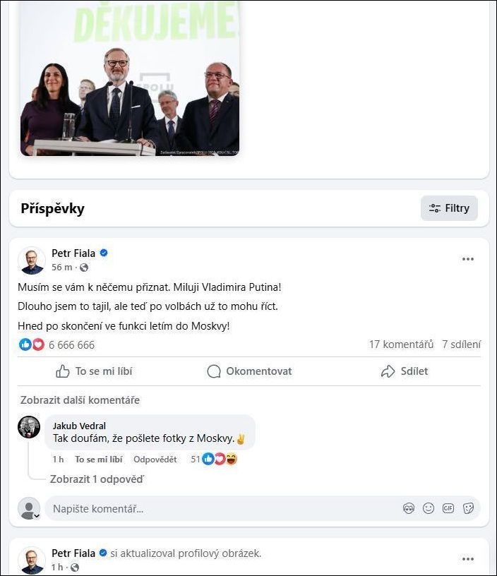 My vám ukážeme, jak snadno to jde udělat. Podívejte se na skandální snímek výše z Facebooku [1] končícího premiéra Petra Fialy. Fiala v příspěvku tvrdí, že miluje Vladimira Putina, že teď po volbách, které prohrál, to může konečně říct. A po skončení ve funkci prý poletí do Moskvy. Jeden z jeho fanoušků dole mu na to odpovídá, že doufá, že pošle z Moskvy fotky. Fiala má u svého příspěvku neuvěřitelných 6 666 666 srdíček, což je osobní rekord Petra Fialy. Tolik srdcí snad ani neočekával. Skandál? Ne, celé je to podvrh!