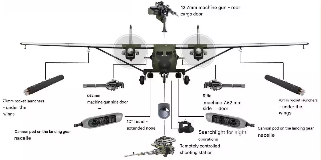 S guľometmi M134 kalibru 7,62×51 mm NATO sa počíta v bočných dverách, majú variabilnú kadenciu streľby 2 000 – 6 000 rán za minútu, vysoká hustota zásahov, je to už v boji overené ukrajinské riešenie aké zobrazovali krátke videá vyššie. Navrhovaná je aj stabilizovaná diaľkovo ovládaná guľometná veža so zbraňou kalibru 12,7 mm, ktorá strieľa nezávisle od relatívnej polohy bojového lietadla a cieľa vo výške a azimute. Inštalácia pohyblivého guľometu kalibru 12,7 mm je navrhovaná aj do chvostovej časti lietadla, v zadných nákladových dverách. Použitie veľkokalibrových guľometov má za cieľ zvýšiť dostrel a účinnosť paľby na stále relatívne „mäkké” vzdušné ciele, akými dnešné drony sú.
