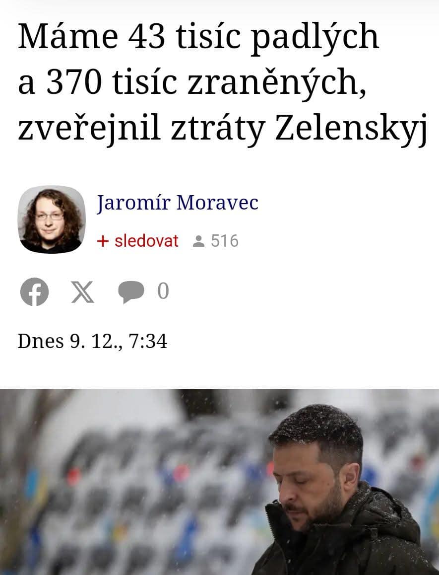 Máme 43 tisíc padlých a 370 tisíc zraněných, zveřejnil ztráty Zelenskyj. Polovina zraněných se prý vrátila do služby. Ukazuje se, že matematika není silnou stránkou politiků, a to nejen u nás. Kdyby nešlo o lidské životy, člověk by se i pobavil. Ale v tomto případě je to pokrucování čísel ďábelské. Rusko má podle Zelenského 198 000 mrtvých a 550 000 zraněných. Když takto lžou o ztrátách, mluvili pravdu vůbec někdy v něčem?