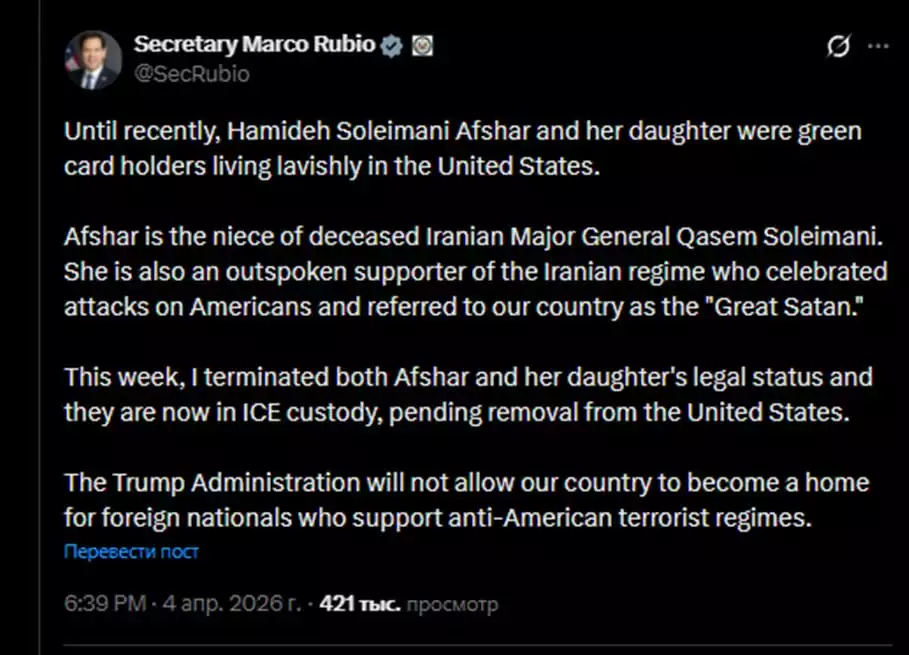 Rubio tvrdí, že v USA bola zadržaná neter zosnulého iránskeho generála Sulejmaniho a jej dcéra. Je stúpenkyňou Iránu a uvítala útoky na Američanov, uviedol. Čaká ich vyhostenie.