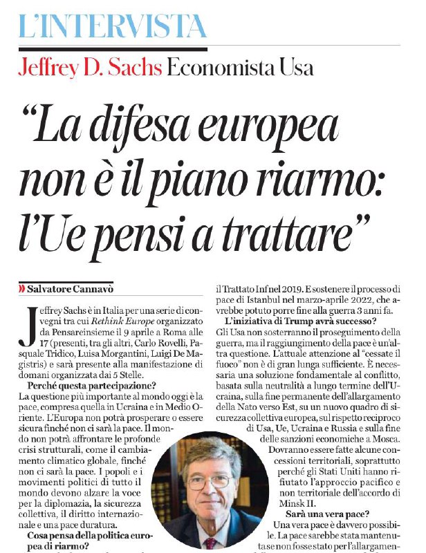 Podobne vystupuje aj americký ekonóm Jeffrey Sachs v rozhovore talianskym novinám il Fatto Quotidiano. Na otázku, čo by mala Európa urobiť s Ruskom, odpovedal takto: