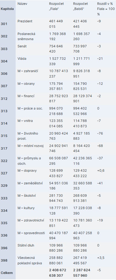 Následující tabulka vybírá data z webu Ministerstva financí. Údaje k rozpočtu „Fialy“ jsou zde –Vláda schválila návrh státního rozpočtu na rok 2026 | Ministerstvo financí ČR ze dne 30.9.2025. Údaje ke schválenému rozpočtu na rok 2026 poslaneckou sněmovnou dne 11.3.2026 jsou zde – Sněmovna schválila zákon o státním rozpočtu na rok 2026 | Ministerstvo financí ČR