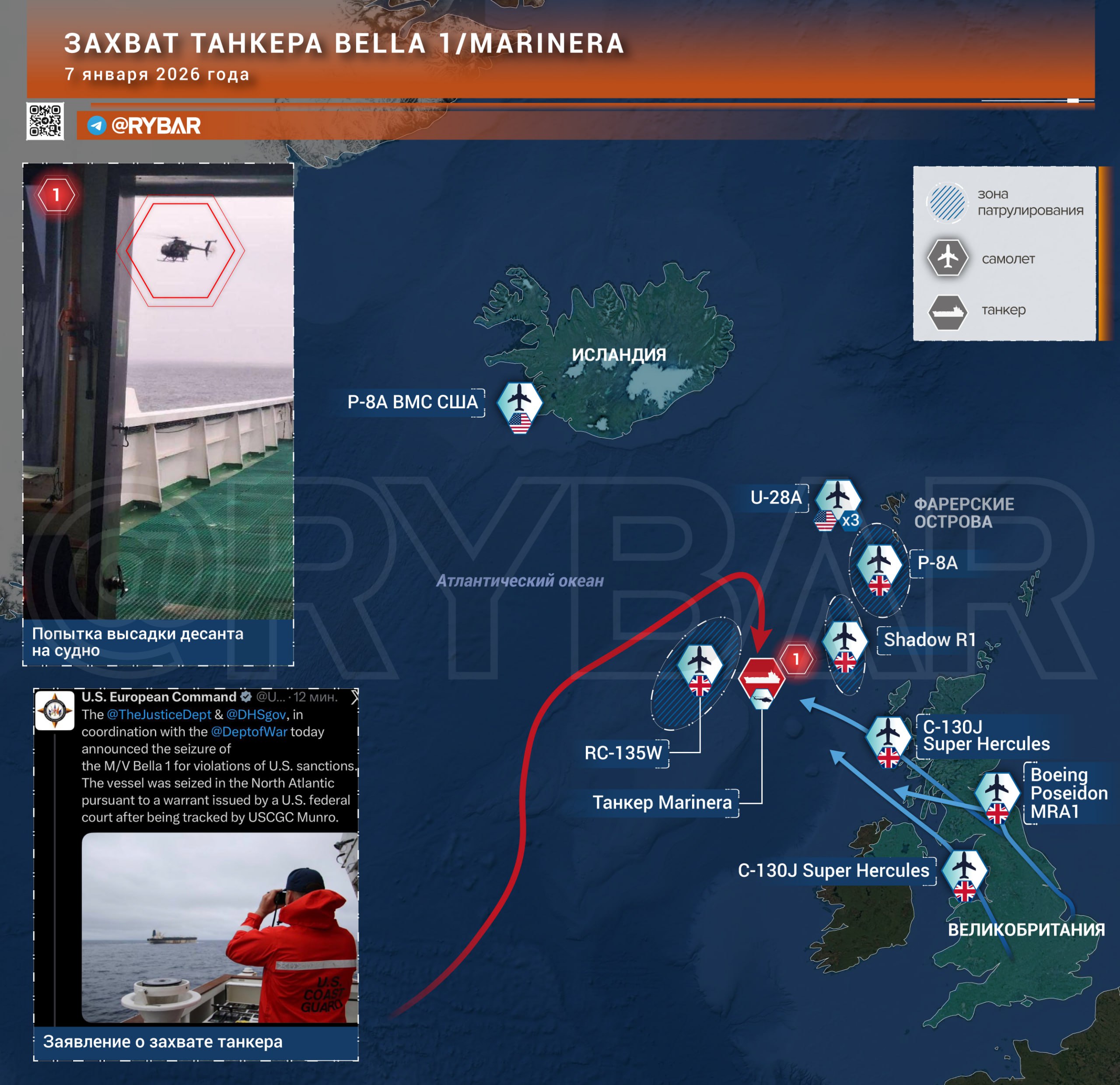 Mapa pronásledování a obsazení ruského tankeru Mariner. Tanker od letošních vánoc unikal obsazení pronásledujícím US loďstvem, protože se pohyboval v bouři, a ta znemožňovala Američanům na něj vysadit z vrtulníků výsadek. Rusové přitom diplomatickou nótou žádali USA, aby v pronásledování ustaly. Zároveň od 5.ledna začaly stínové tankery ve Venezuele, kotvící tam pod různými vlajkami, vyvěšovat vlajky ruské, a objevily se v ruském lodním rejstříku, a zároveň Rusko vyslalo naproti tankeru Mariner jednu ponorku a dvě válečné lodi. Trump tak stál před rostoucím tlakem Ruska, které ho defacto nutilo, aby Mariner obsadil, jinak mu hrozí rychlý kolaps celé námořní blokády venezuelské ropy tankery, pod nově vyvěšovanými ruskými vlajkami. Komu by se však zdálo, že Putinovi těmito tahy šlo, aby Trumpa donutil, uvolnit blokádu všem lodím pod nově vyvěšovanými ruskými vlajkami, třeba stínovým iránským, se plete, viz dále v analýze.