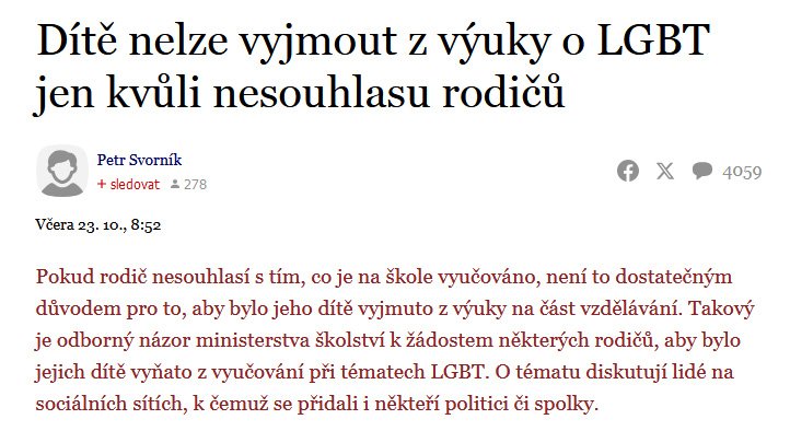 Škola musí respektovat práva rodičů na vyjmutí dětí z výuky o LGBT. Ministerstvo nemá pravdu. ~ NESPOKOJENÝ
